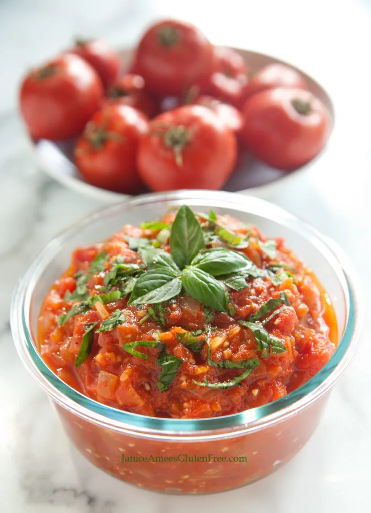 Arrabbiata, in Italian means angry, and in this case it refers to the amount of heat in the sauce. You may adjust the temperature by adding more or less of the dried red pepper. It’s inexpensive, easy-to-make, and spicy, and it goes perfectly with gluten free bread, GF pasta, zucchini noodles, fish, poultry, or meat. It can be made several days before you need it. It freezes well too, for those days you need a quick dinner. Just defrost, reheat and serve with or atop your favorite dish.