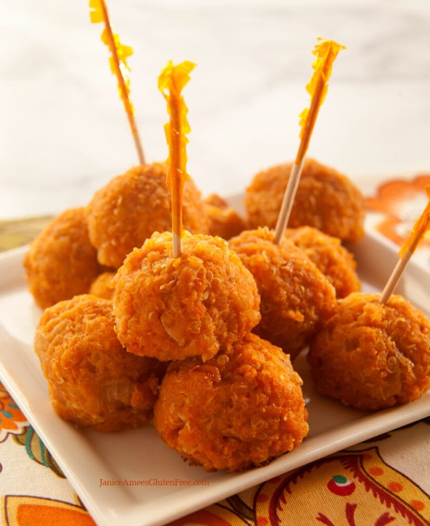 You know those nights when you’re left with just a dab of mashed potatoes? You hate to toss them out, yet there’s not enough do serve for another meal. So why not use them to make these gluten free poppers? You only need 1/2 cup! And there’s no need for breadcrumbs in these bite-size babies, because you’ll use the healthy goodness of Quinoa, instead.
